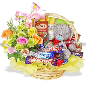 Радужная фантазия - корзина подарочная с цветами и конфетами