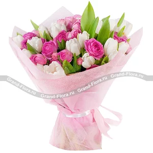 Алена / г. Владимир / 14.09.2020Оценка букета:Спасибо за букет и за внимание со стороны сотрудников компании. Для букета не хватало белой альстромерии, мне перезвонили и согласовали замену на тюльпаны другого цвета. Очень круто, спасибо!