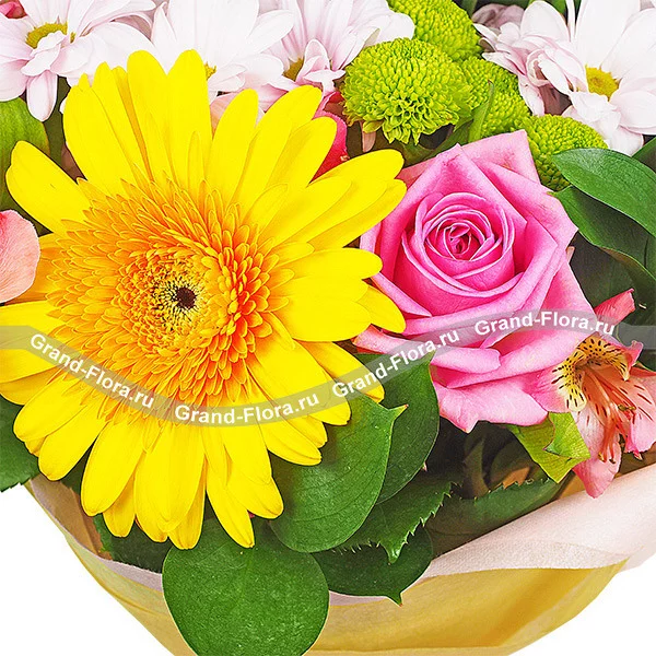 Уменьшенный: роза розовая - 3 шт, гербера желтая - 1 шт, альстромерия розовая - 2 шт, хризантема кустовая зеленая - 2 шт, хризантема кустовая светлая - 1 шт, рускус, фетр желтый. Примерный размер: 20Х20 см.