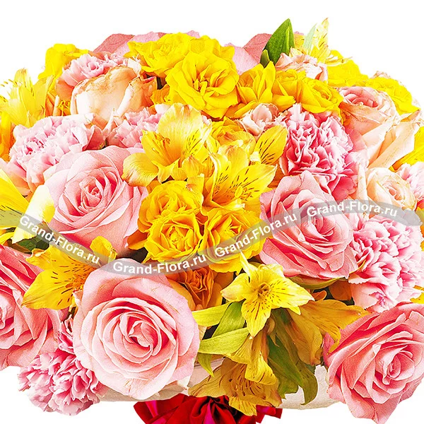 ДЕЛЮКС: роза розовая - 21 шт., роза кустовая желтая - 10 шт., альстромерия желтая - 10 шт., гвоздика одноголовая розовая - 18 шт., фетр розовый, бант розовый, + коробка конфет в подарок.