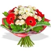 Уменьшенный: Гербера красная/розовая/малиновая - 3 шт., хризантема белая кустовая - 1 шт., роза кустовая кремовая - 1 шт., салал - 2 шт., фетр красный.