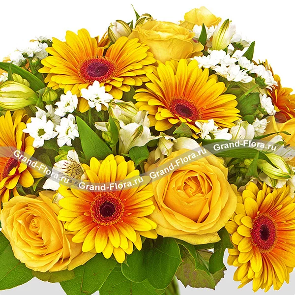 Стандартный: гербера желтая - 3 шт., роза желтая - 5 шт., хризантема белая кустовая - 3 шт., альстромерия белая - 3 шт., салал - 3 шт., упаковка.