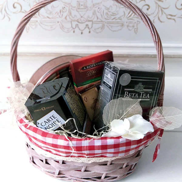 Стандартный: шоколад "Коркунов" - 1 шт., шоколад "Россия" - 1 шт., шоколад "Бабаевский" - 1 шт., кофе "Carte Noire" - 95 г., чай "Beta Tea" - 100 г., печенье в железной коробке, декор, корзина.