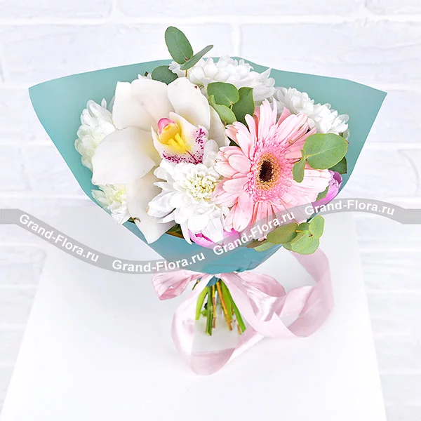 Уменьшенный: гербера розовая - 1 шт.,орхидея белая - 1 шт., тюльпан розовый - 2 шт., хризантема кустовая белая - 1 шт., декоративная зелень, упаковка, лента.