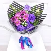 Фиолетовая хризантема и фиолетовая эустома в этом букете символизируют красоту и элегантность, а также добавляют элементы духовности и мудрости. Полосатая упаковка добавляет еще больше элегантности и изысканности к букету. Этот букет может быть прекрасным выбором для тех, кто хочет выразить свою мудрость или духовность или просто подарить красоту и гармонию кому-то близкому.