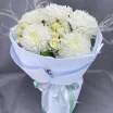 Стандартный: хризантема одноголовая белая - 3 шт, роза кустовая белая - 4 шт, упаковка, лента